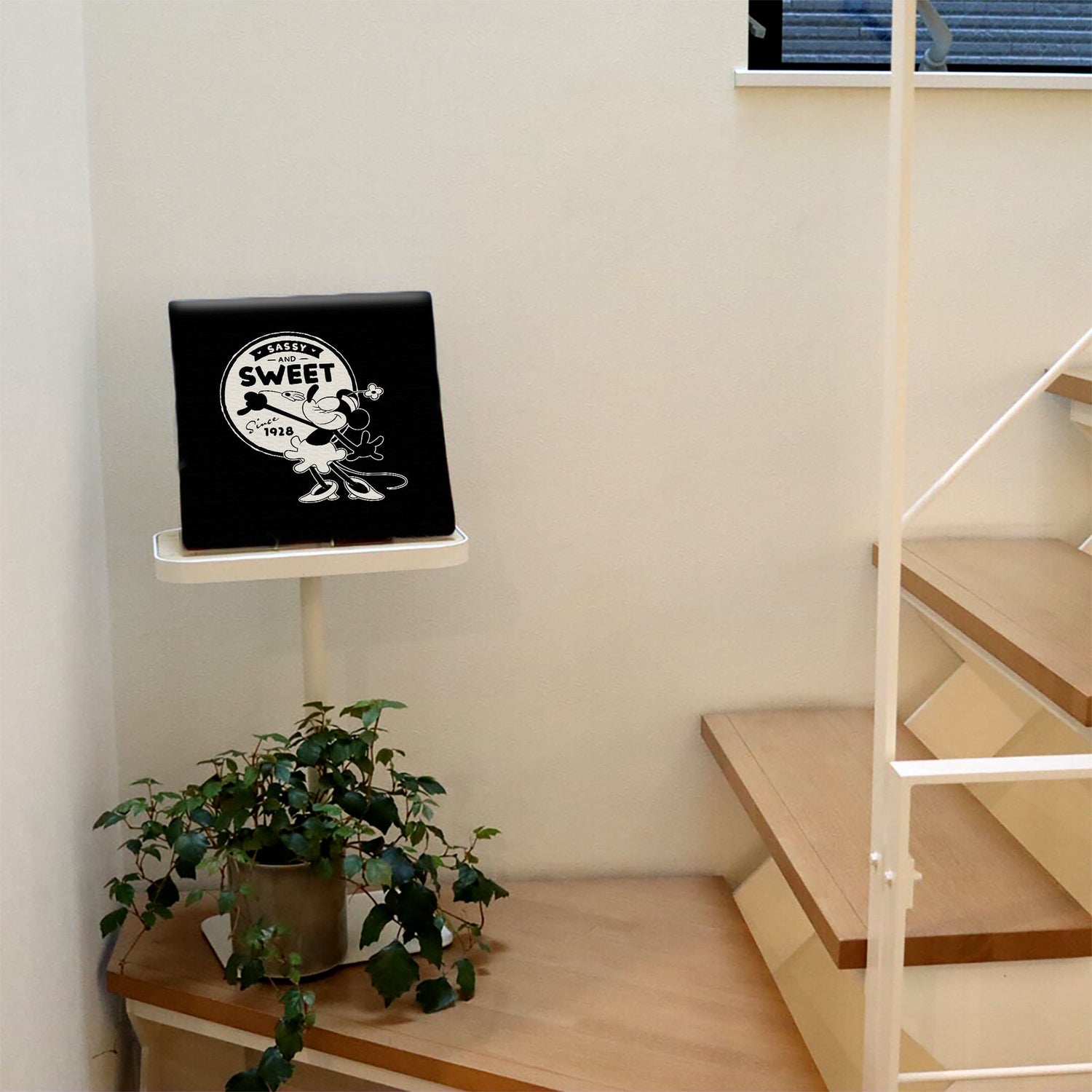 スマホ並みの軽量で(150g)テープやピンで壁に優しく飾れます。*Mサイズの場合