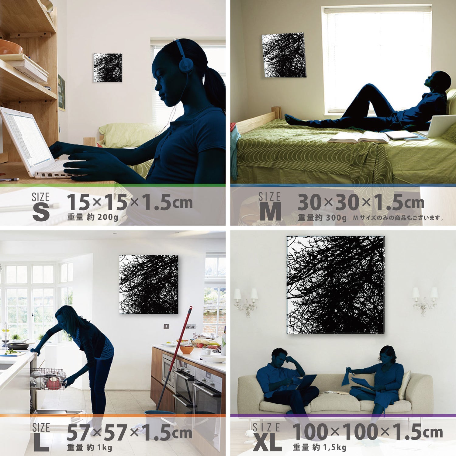 スマホ並みの軽量で(150g)テープやピンで壁に優しく飾れます。*Mサイズの場合