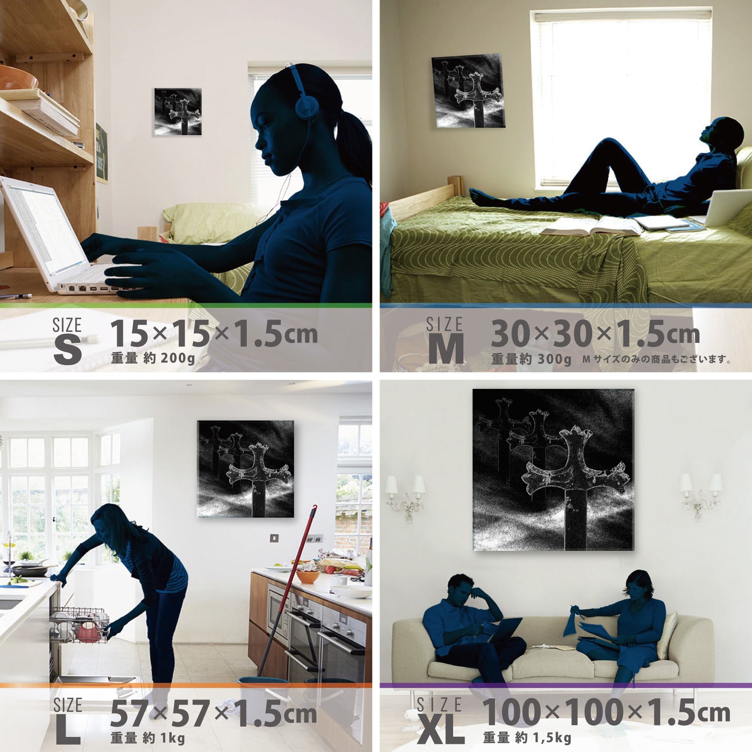 スマホ並みの軽量で(150g)テープやピンで壁に優しく飾れます。*Mサイズの場合