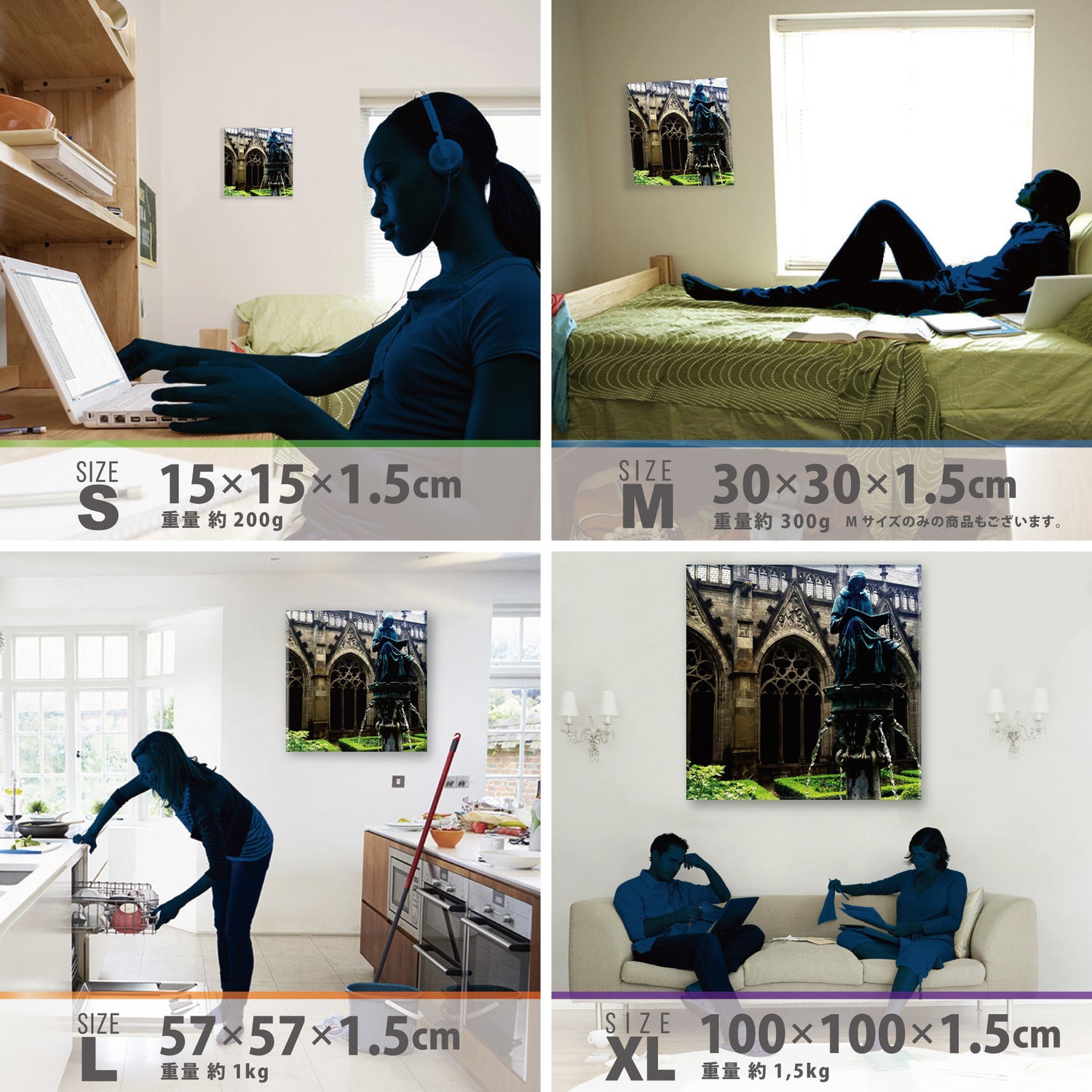スマホ並みの軽量で(150g)テープやピンで壁に優しく飾れます。*Mサイズの場合