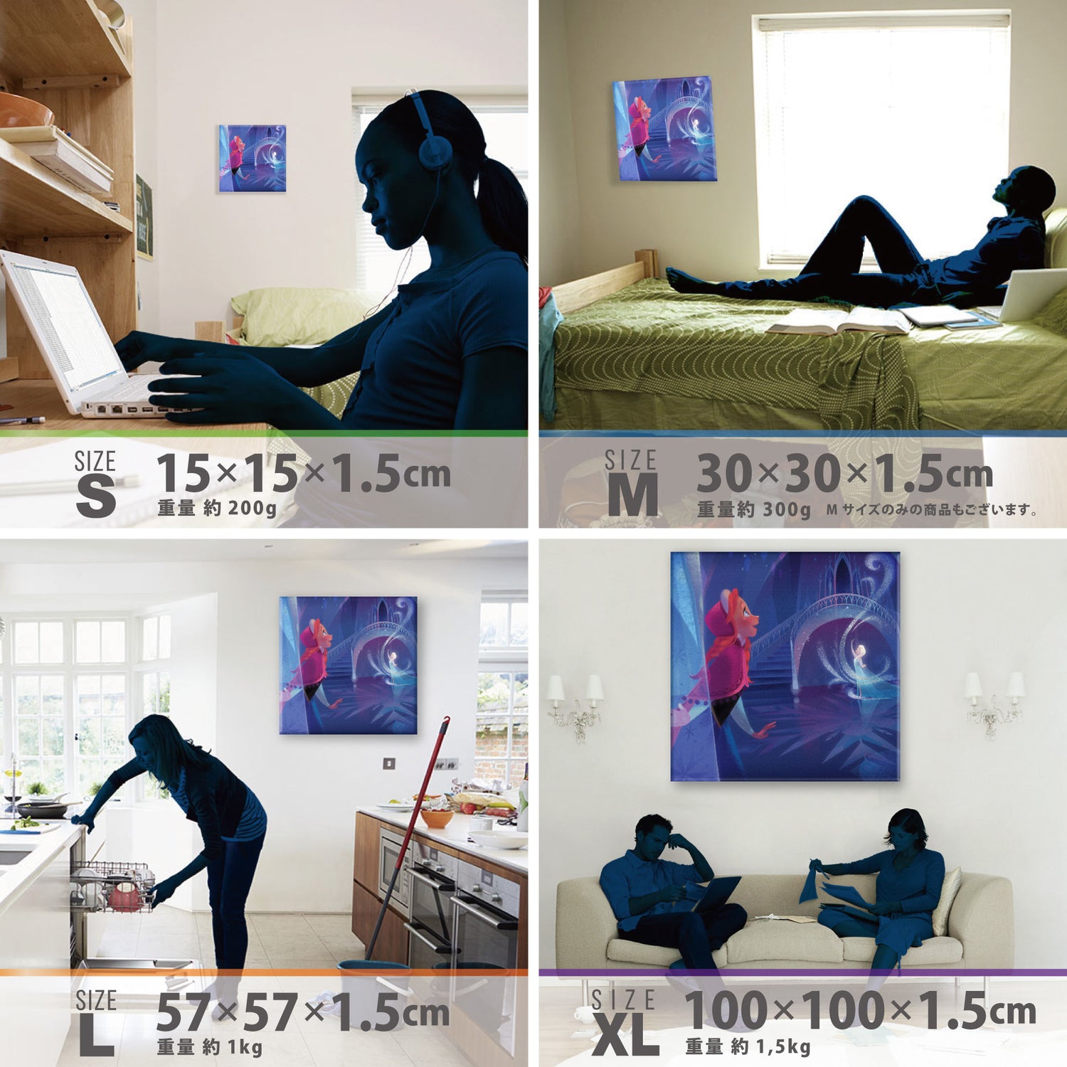スマホ並みの軽量で(150g)テープやピンで壁に優しく飾れます。*Mサイズの場合