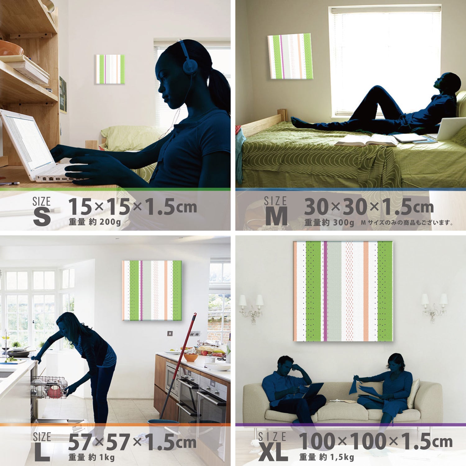 スマホ並みの軽量で(150g)テープやピンで壁に優しく飾れます。*Mサイズの場合