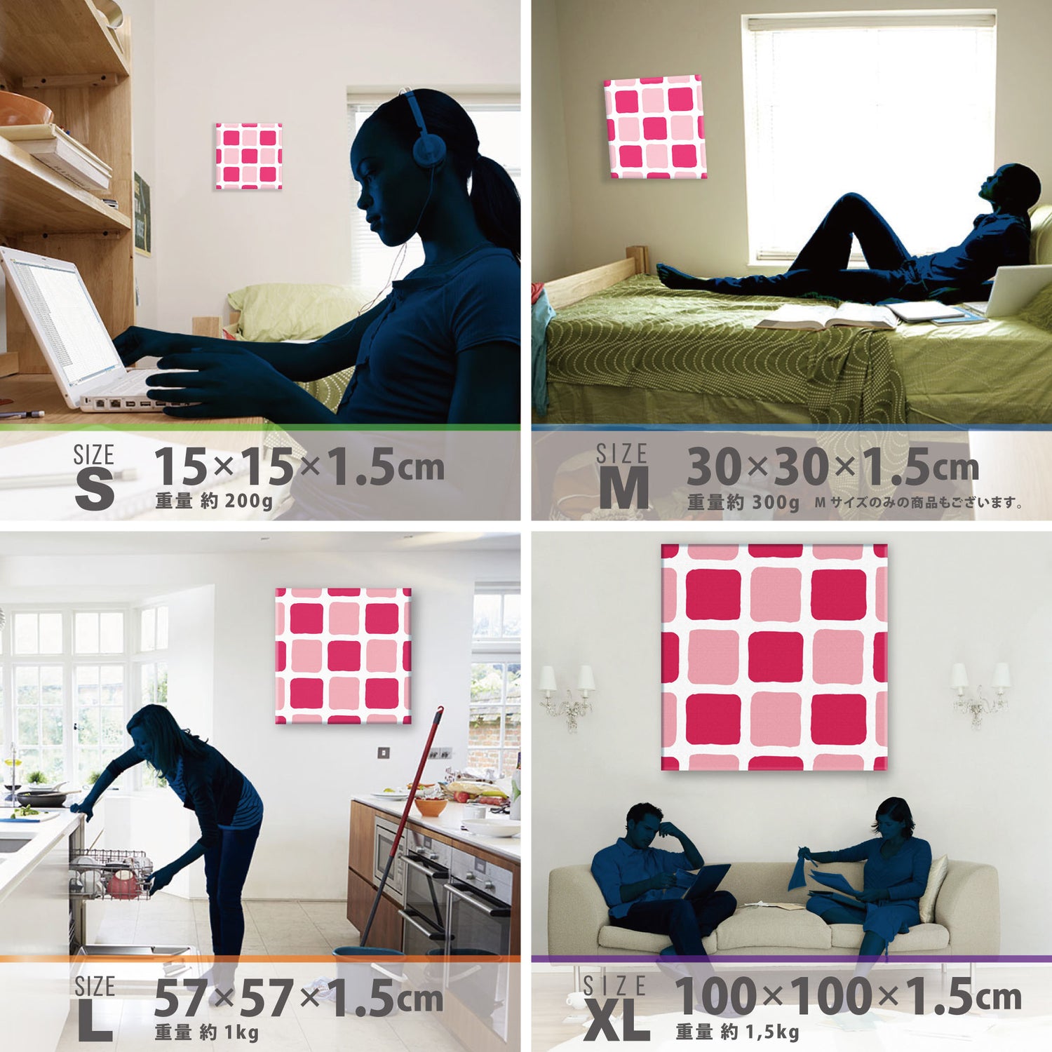 スマホ並みの軽量で(150g)テープやピンで壁に優しく飾れます。*Mサイズの場合