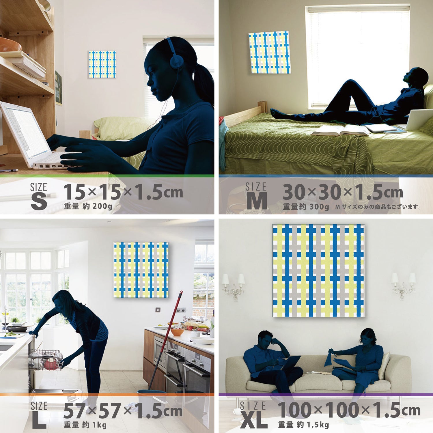スマホ並みの軽量で(150g)テープやピンで壁に優しく飾れます。*Mサイズの場合