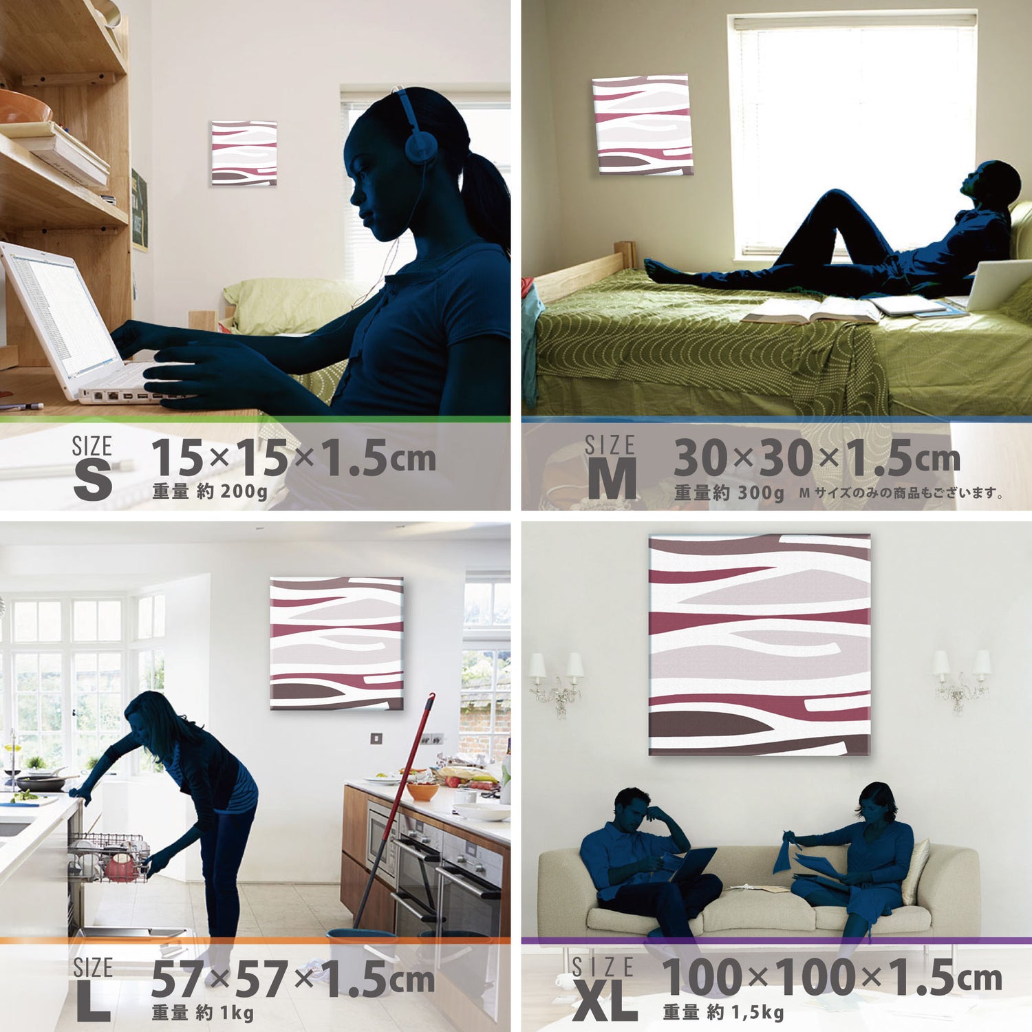 スマホ並みの軽量で(150g)テープやピンで壁に優しく飾れます。*Mサイズの場合