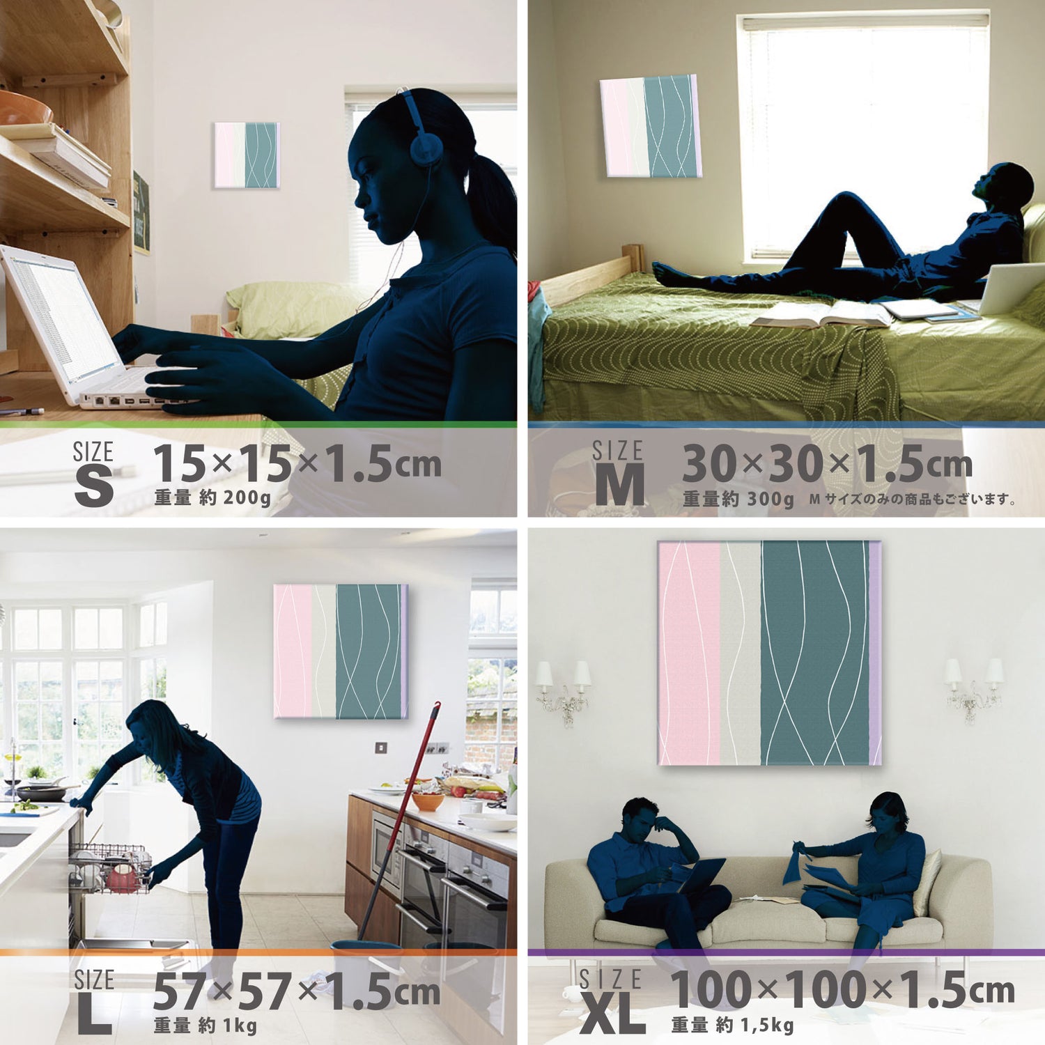 スマホ並みの軽量で(150g)テープやピンで壁に優しく飾れます。*Mサイズの場合