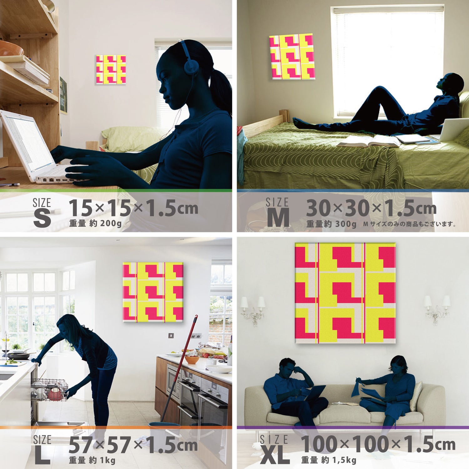 スマホ並みの軽量で(150g)テープやピンで壁に優しく飾れます。*Mサイズの場合
