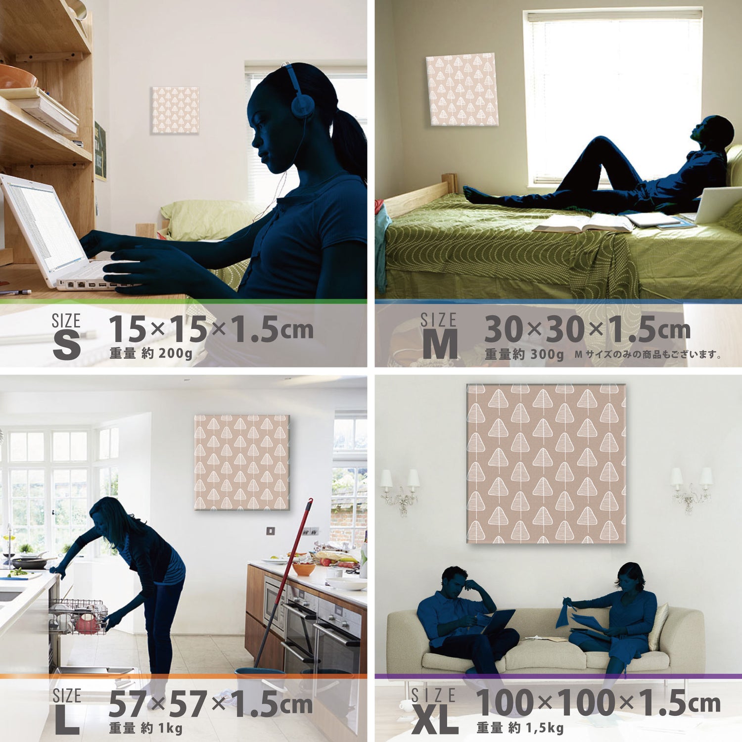 スマホ並みの軽量で(150g)テープやピンで壁に優しく飾れます。*Mサイズの場合
