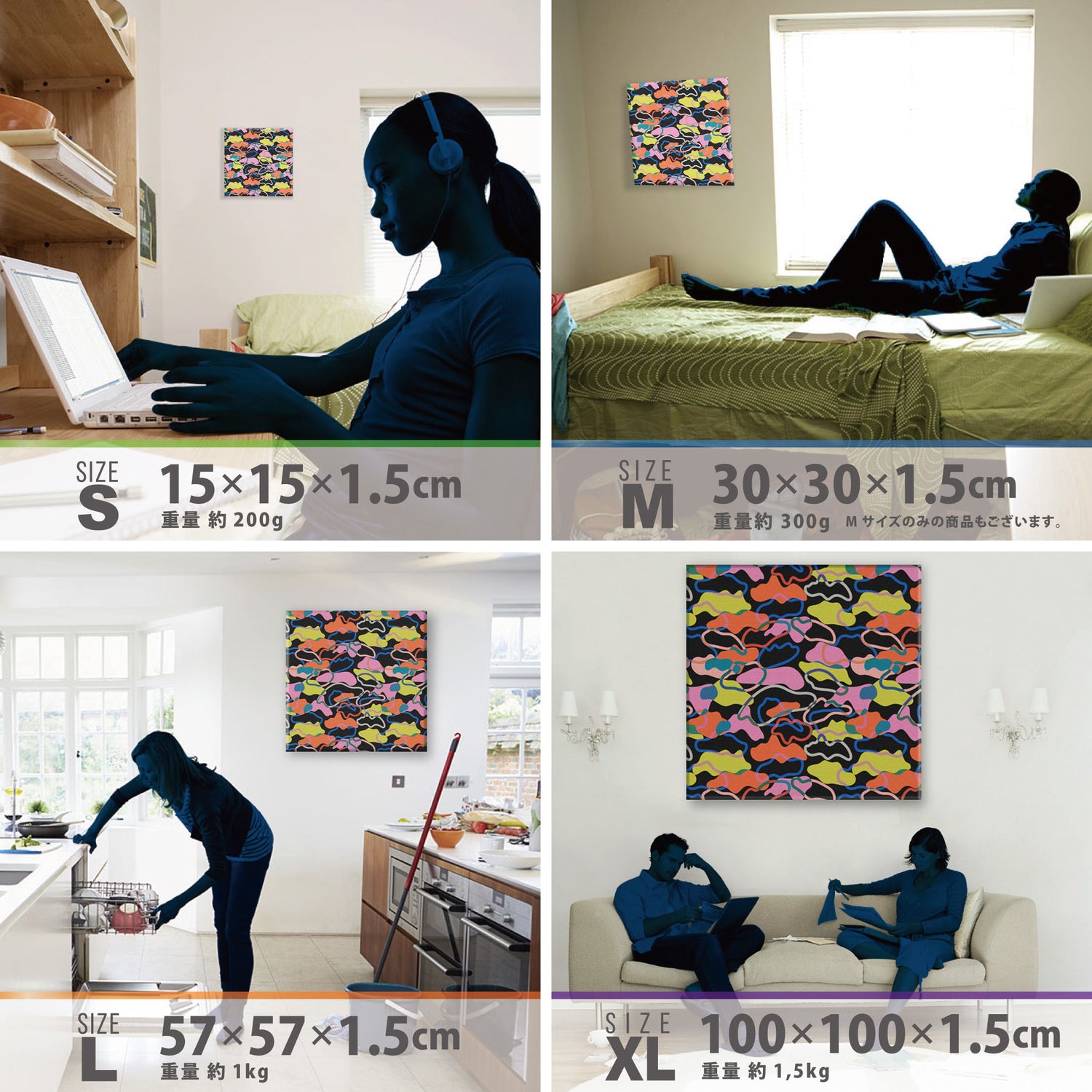 スマホ並みの軽量で(150g)テープやピンで壁に優しく飾れます。*Mサイズの場合