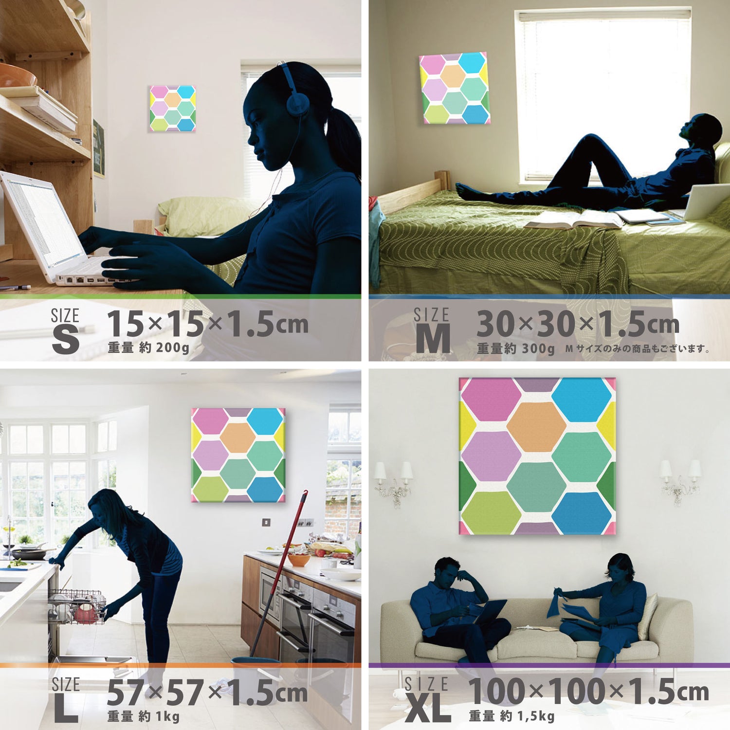 スマホ並みの軽量で(150g)テープやピンで壁に優しく飾れます。*Mサイズの場合