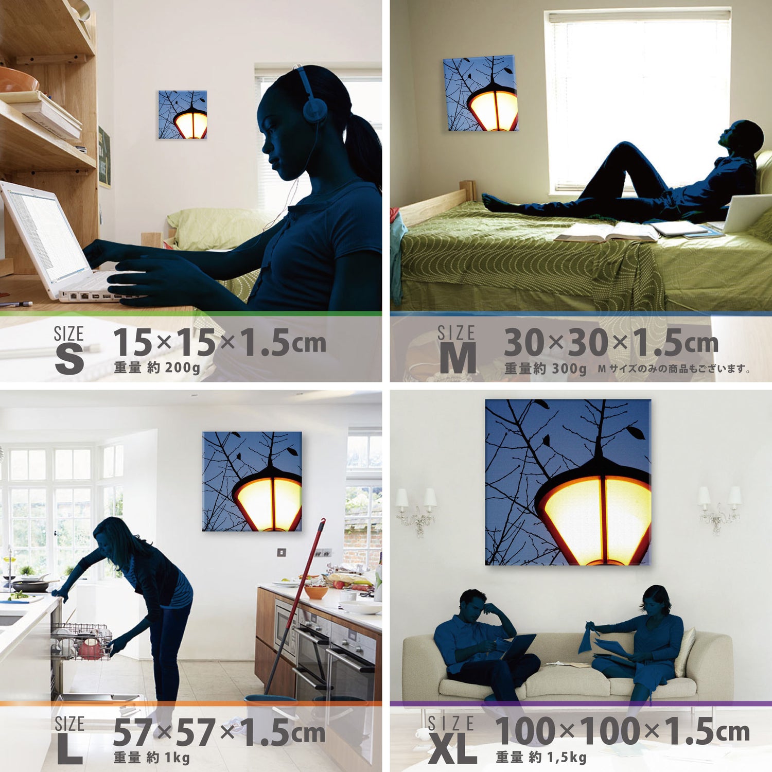 スマホ並みの軽量で(150g)テープやピンで壁に優しく飾れます。*Mサイズの場合