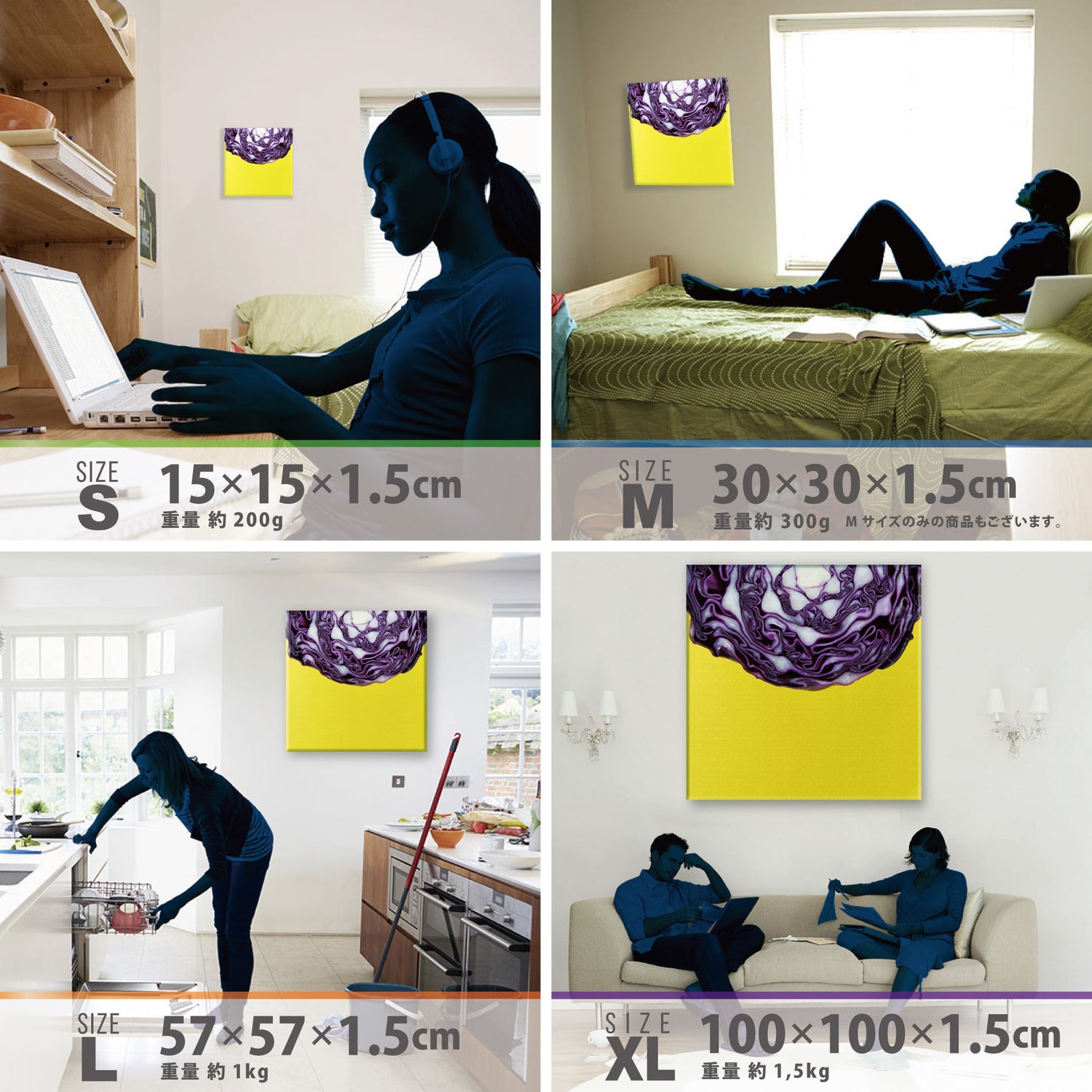 スマホ並みの軽量で(150g)テープやピンで壁に優しく飾れます。*Mサイズの場合