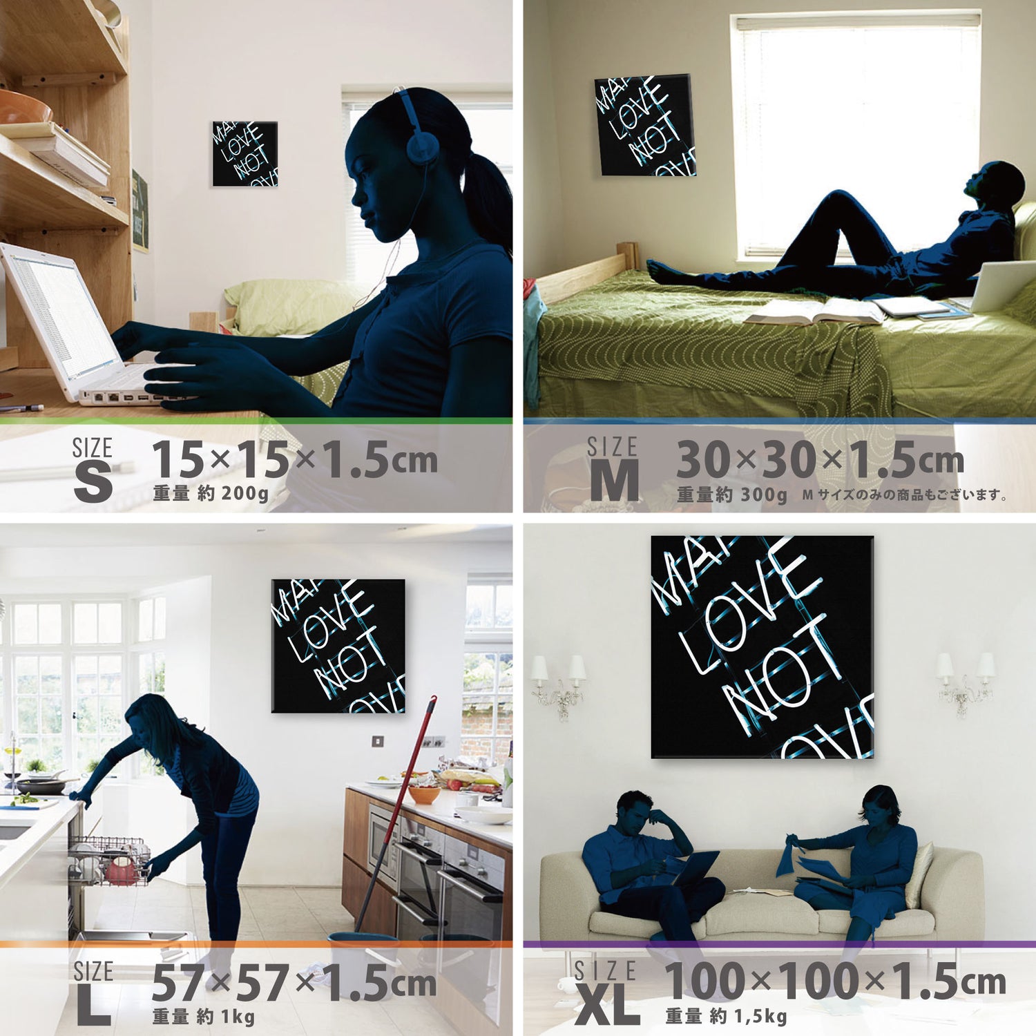 スマホ並みの軽量で(150g)テープやピンで壁に優しく飾れます。*Mサイズの場合