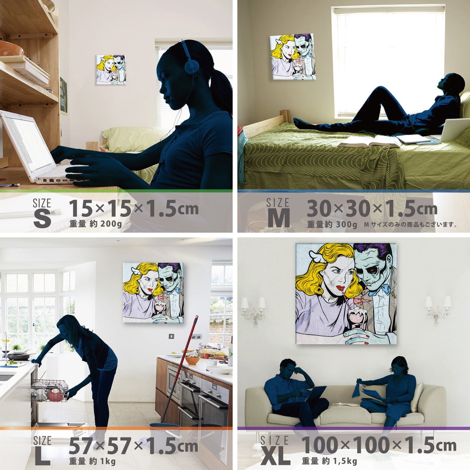 スマホ並みの軽量で(150g)テープやピンで壁に優しく飾れます。*Mサイズの場合