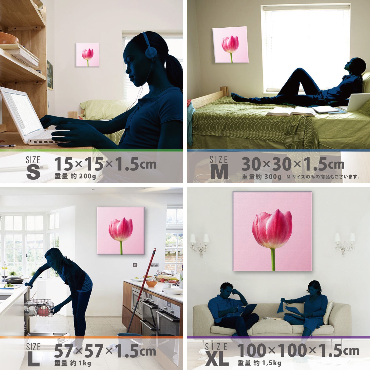 スマホ並みの軽量で(150g)テープやピンで壁に優しく飾れます。*Mサイズの場合