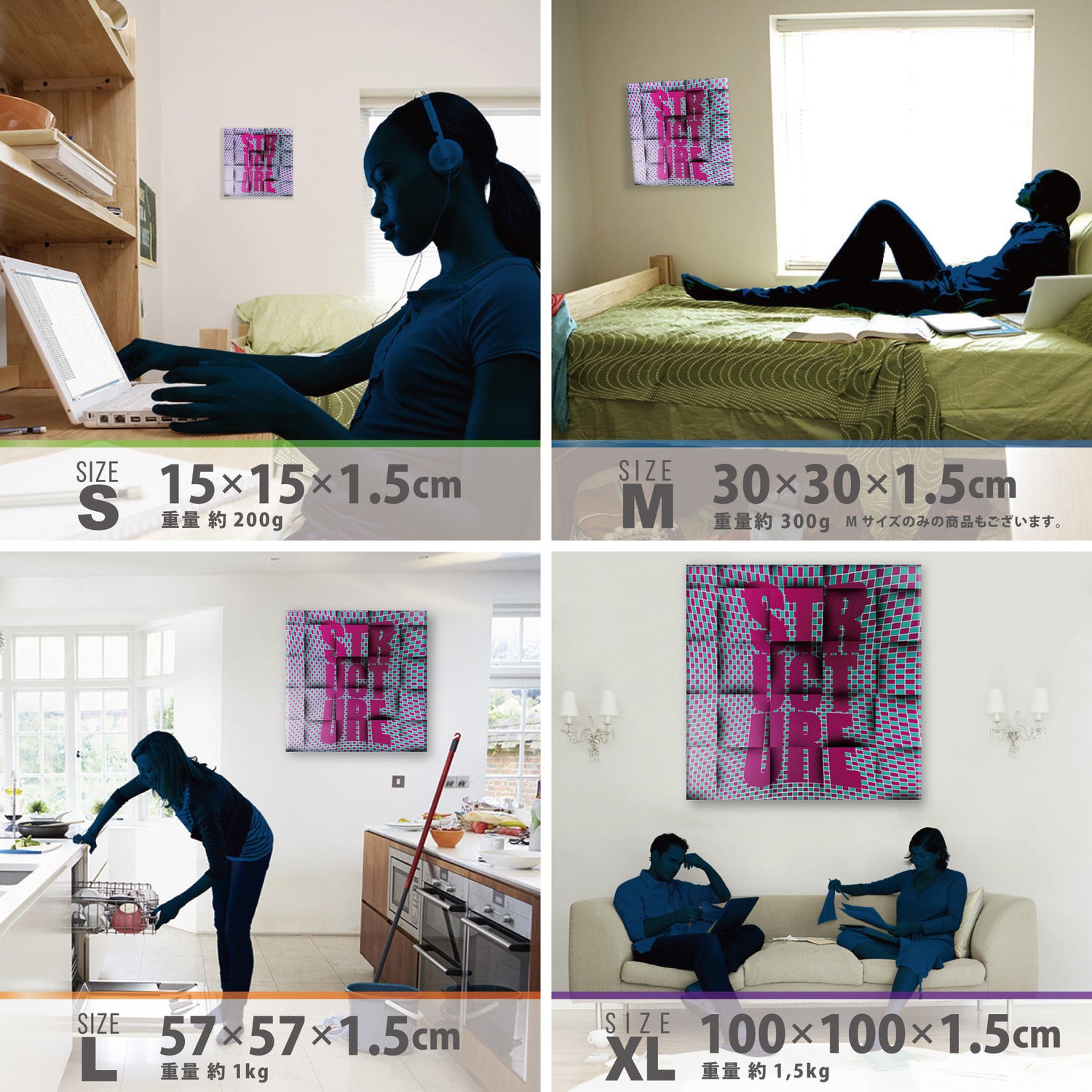 スマホ並みの軽量で(150g)テープやピンで壁に優しく飾れます。*Mサイズの場合