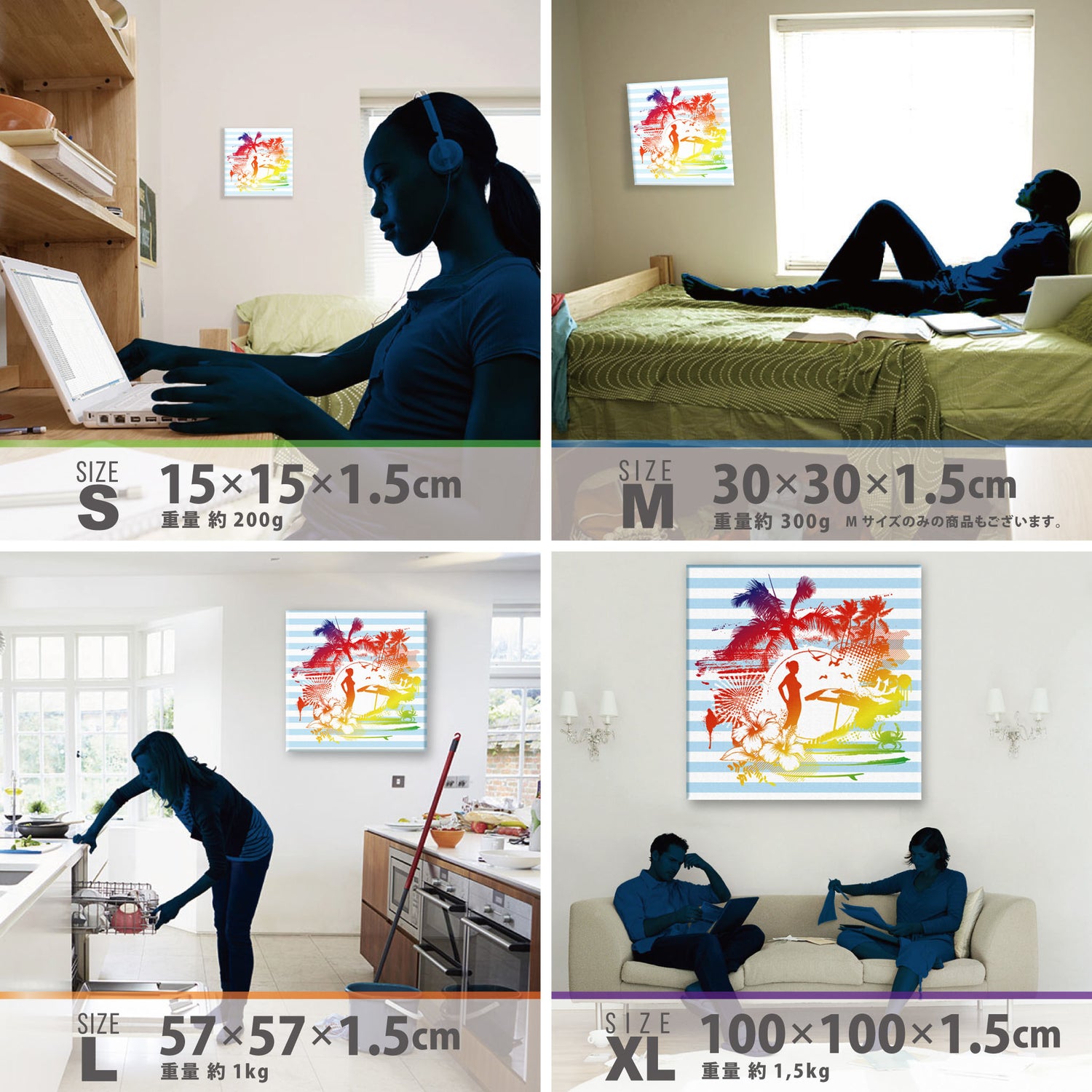 スマホ並みの軽量で(150g)テープやピンで壁に優しく飾れます。*Mサイズの場合
