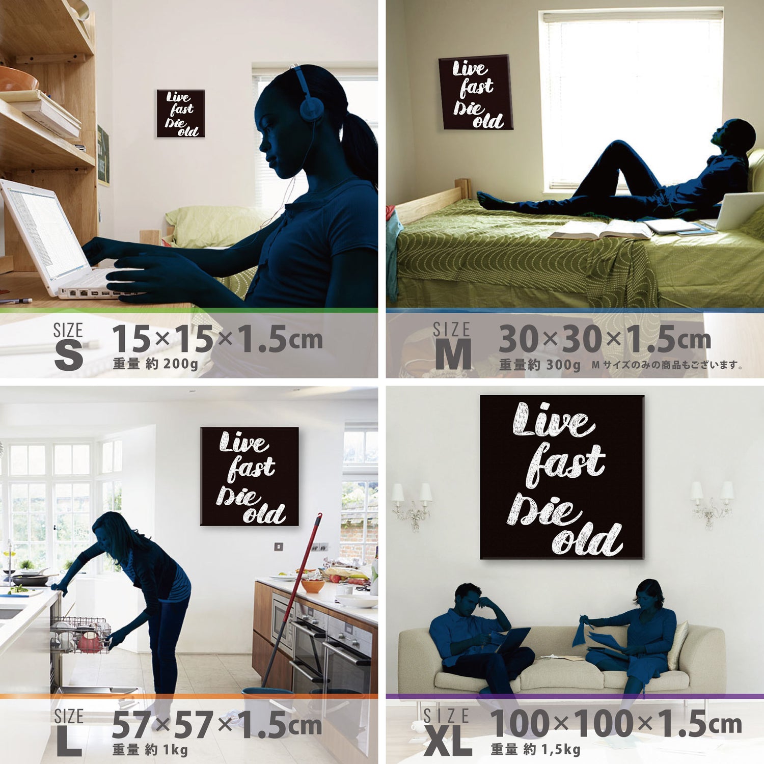 スマホ並みの軽量で(150g)テープやピンで壁に優しく飾れます。*Mサイズの場合
