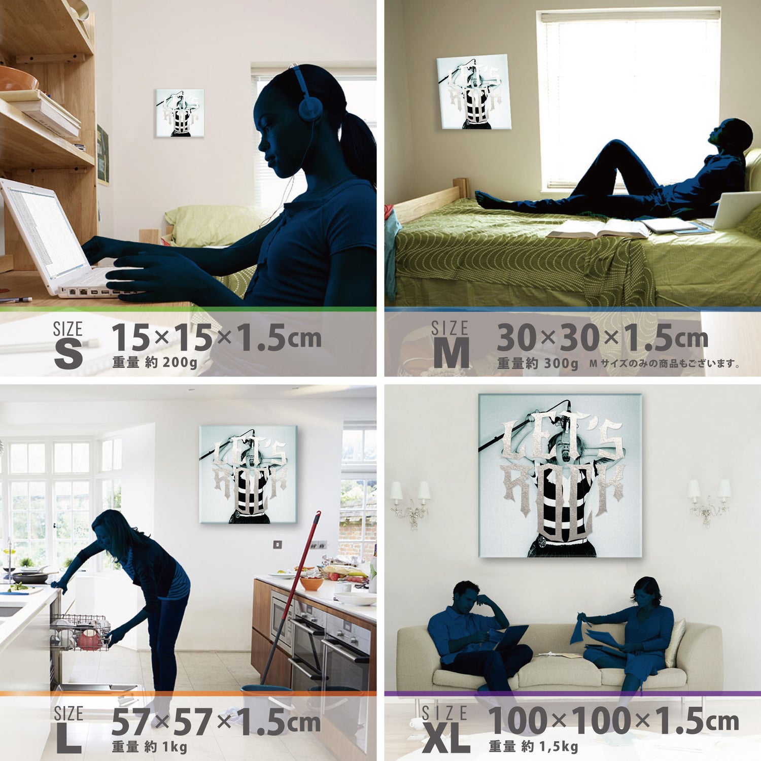 スマホ並みの軽量で(150g)テープやピンで壁に優しく飾れます。*Mサイズの場合