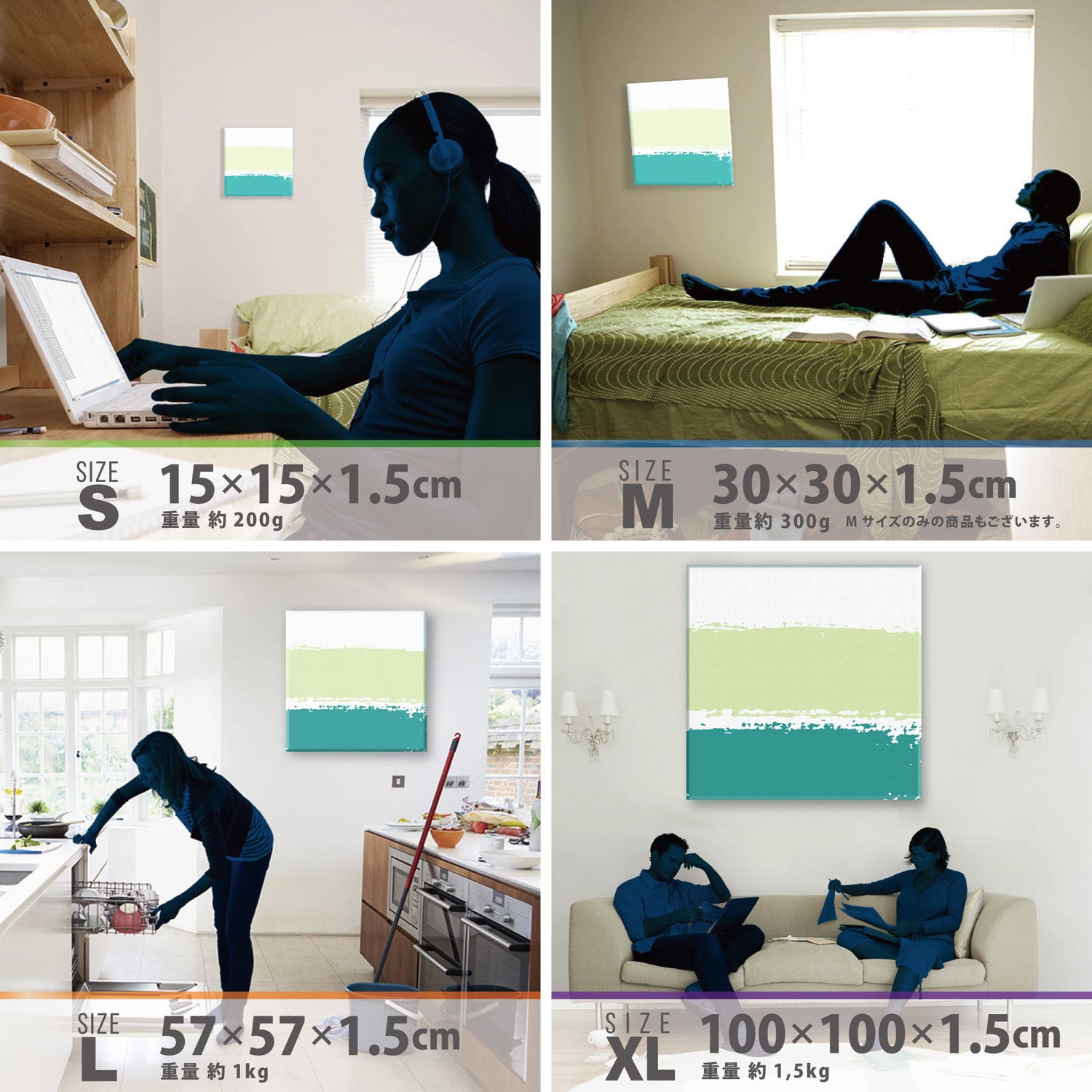 スマホ並みの軽量で(150g)テープやピンで壁に優しく飾れます。*Mサイズの場合