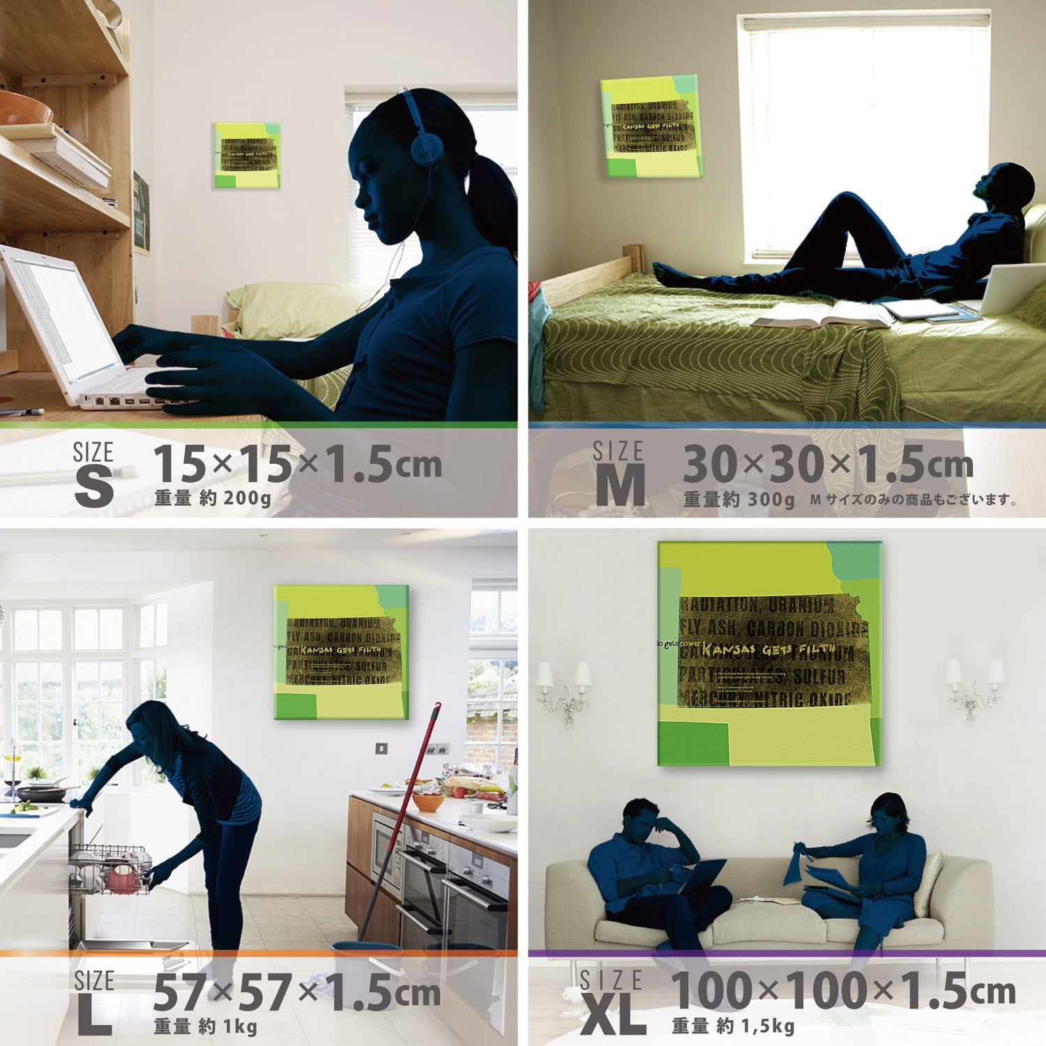 スマホ並みの軽量で(150g)テープやピンで壁に優しく飾れます。*Mサイズの場合