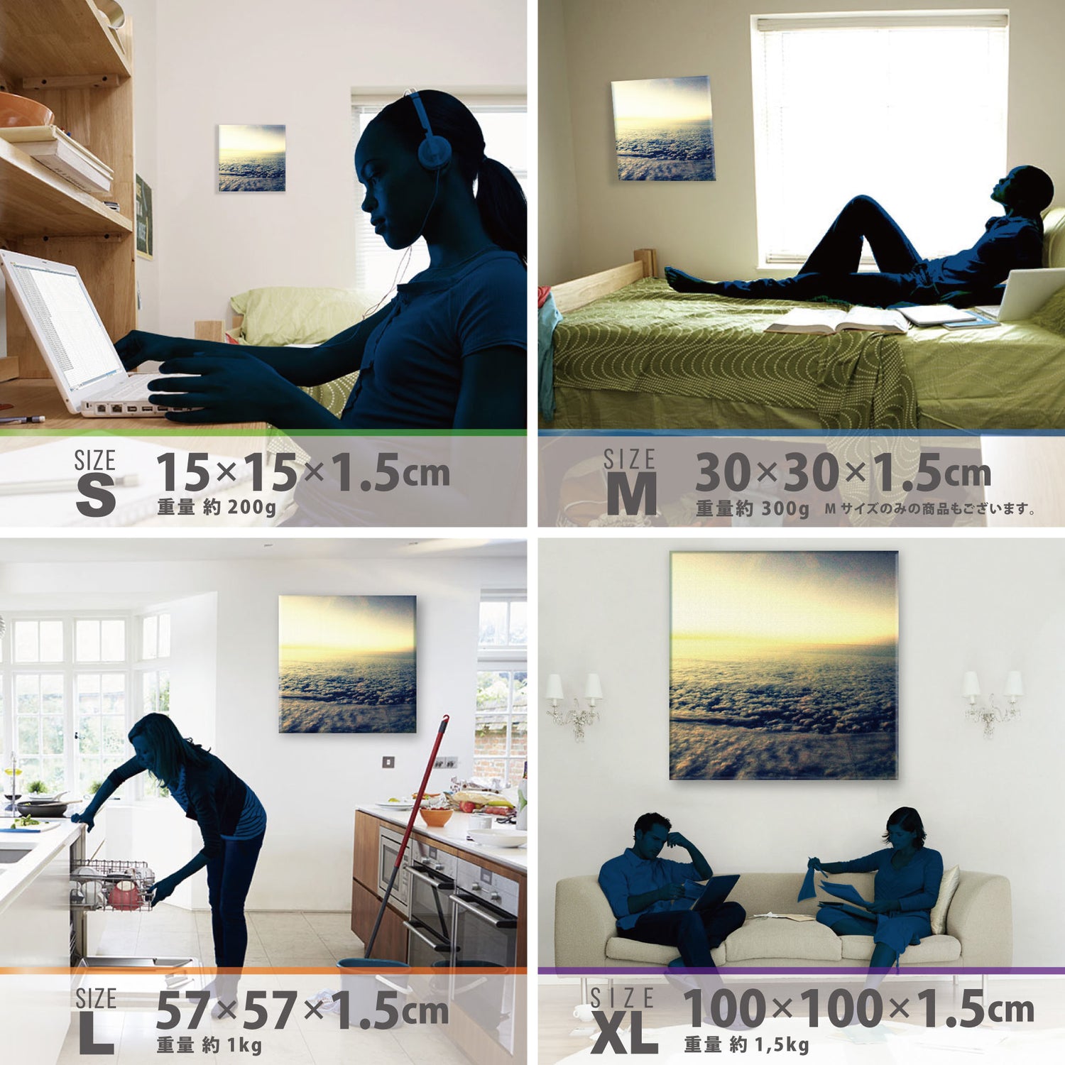 スマホ並みの軽量で(150g)テープやピンで壁に優しく飾れます。*Mサイズの場合