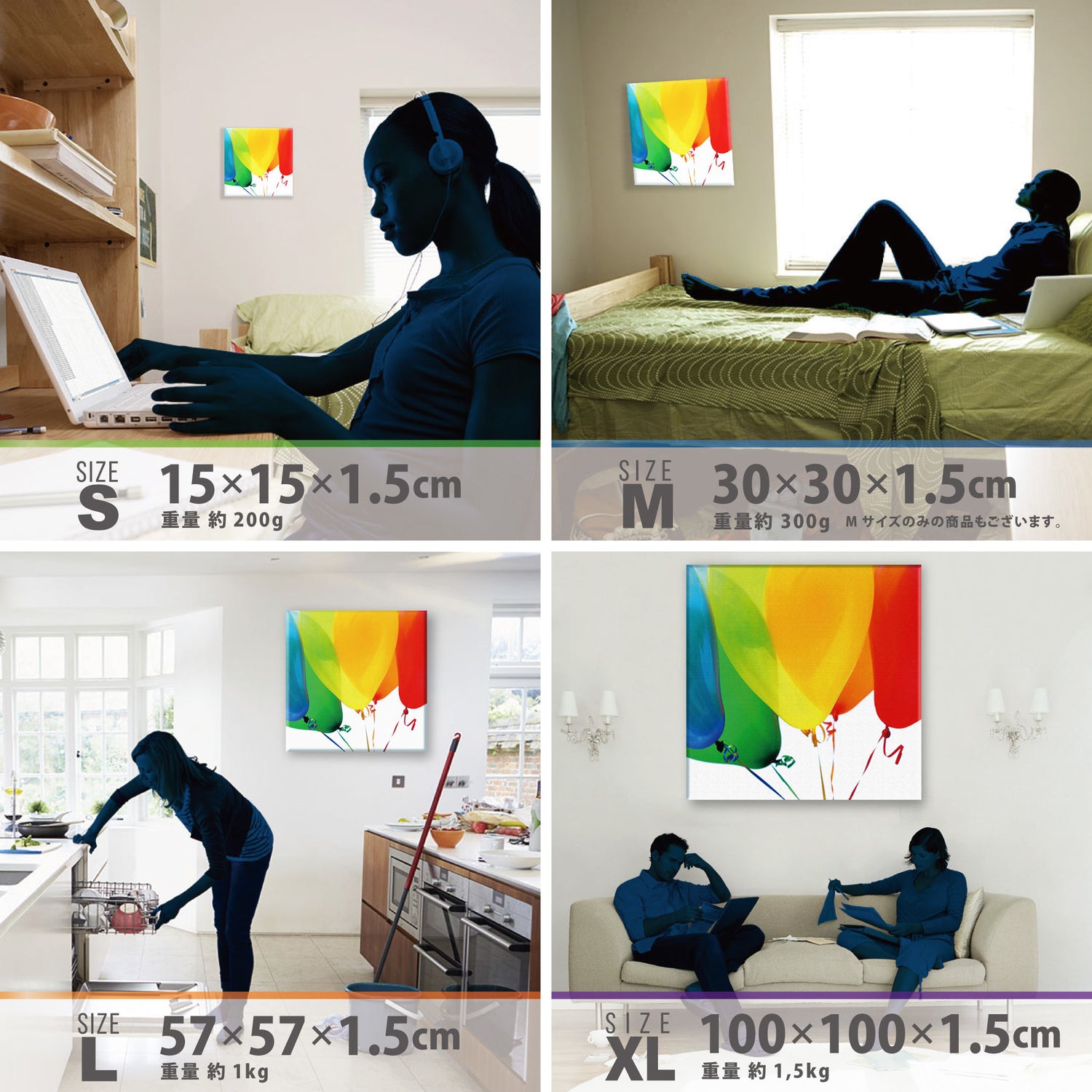 スマホ並みの軽量で(150g)テープやピンで壁に優しく飾れます。*Mサイズの場合
